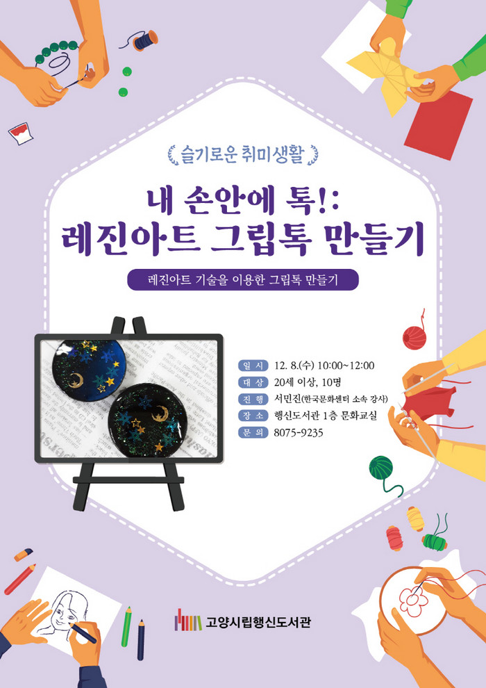 이날 참여자들은 레진아트 공예를 활용하여 휴대폰을 거치할 수 있는 그립톡을 만들게 된다. 본 강의는 행신도서관에서 오프라인으로 진행되며 서민진 한국문화센터 소속 강사가 강의를 맡는다.