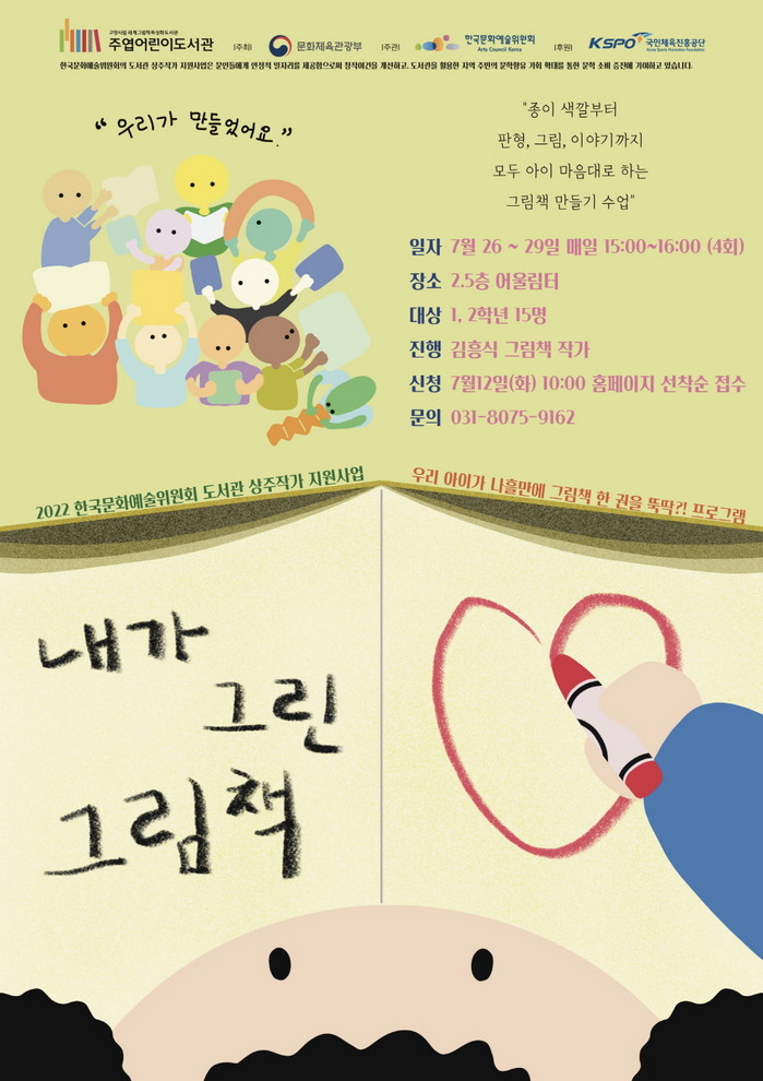 그림책 만들기 프로그램 ‘내가 그린 그림책’은 초등 1~2학년을 대상으로 7월 26일부터 7월 29일까지 총 4회에 진행된다. ▲다양한 그림책 소개 ▲캐릭터 만드는 법 ▲스토리 만드는 법 ▲그림책 만들기 등 개성 있는 나만의 그림책을 완성해보는 어린이 작가 체험 프로그램이다.