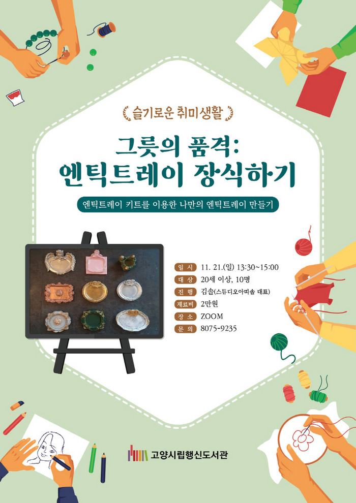[부자동네타임즈 김인수기자] 고양시 행신도서관이 성인을 대상으로 11월 21일(일) 엔틱트레이 만들기 원데이 프로그램인 슬기로운 취미생활 그릇의 품격을 운영한다.