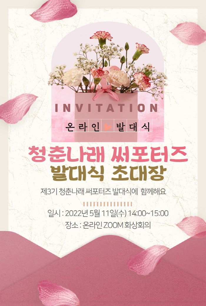 이들은 4월 ‘청춘나래 서포터즈 표현하기’ 사전 미션으로 올해 활동을 시작했다. 서포터즈는 마음건강과 관련된 교육(조기정신증 지킴이, 우울, 불안, 강박 등) 게시물 블로그 게시, 카드뉴스 및 동영상 제작, SNS 업로드, 마음건강 캠페인 등의 다양한 온·오프라인 활동을 통해 청년 정신건강의 중요성을 알리고 편견을 해소하는 인식개선 활동을 수행한다.