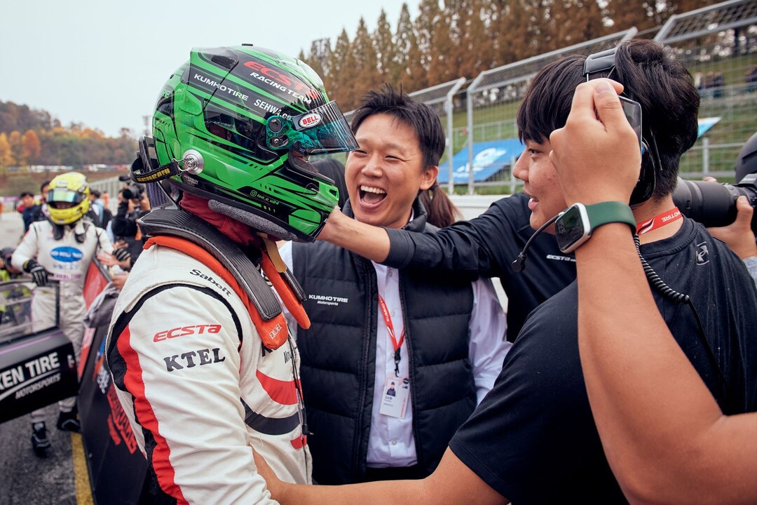 [사진설명] 이창욱이 2023 CJ대한통운 슈퍼레이스 챔피언십 7라운드에서 우승을 차지한 뒤 팀원과 기쁨을 나누고 있다.