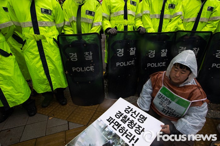 (서울=포커스뉴스) 전국농민회총연맹 회원들이 18일 오후 서울 서대문구 경찰청을 기습 방문 강신명 경찰청장과의 면담을 요구하며 시위를 벌이고 있다. 이날 전농 회원들은 11.14 민중총궐기 대회에서 경찰의 물대포 진압으로 현재 생명이 위중한 백남기씨 사건에 항의하며 강 청장과의 면담을 거듭 요구했지만 경찰 측의 제지로 인해 민원실에 진정서를 낸 후 해산했다.