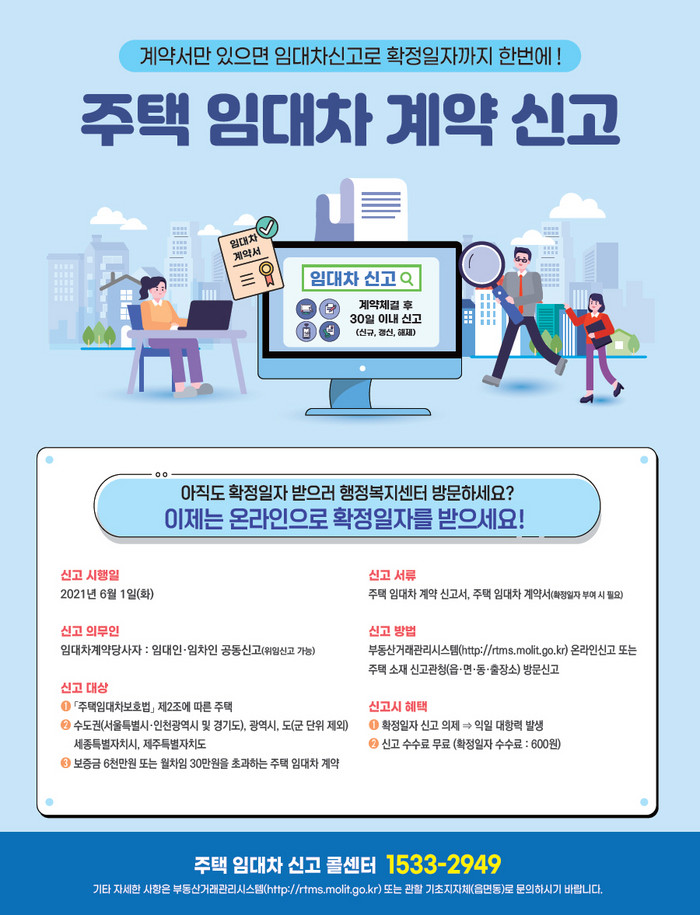 구 관계자는 “임대차 신고 시 계약서를 제출하는 경우 임대차보호법상 확정일자가 자동으로 부여되는 등 임차인의 권리보호를 위한 제도이므로 신고기한 내에 신고하여 제도시행에 따른 불이익을 당하지 않도록 유의해줄 것을 당부한다”고 전했다.