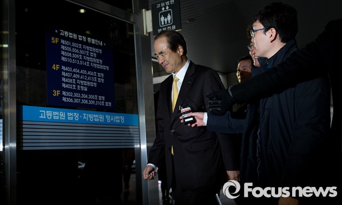 (서울=포커스뉴스) 1000억원대 사기성 기업어음(CP)을 발행한 혐의로 기소된 윤석금 웅진그룹 회장이 14일 오후 서울 서초구 서울고등법원에서 열린 항소심 선고공판에 출석하고 있다.
