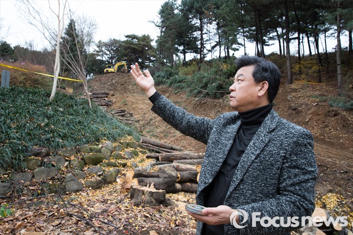| △ 23일 오후 서울 동작구 국립현충원 제3장군묘역 인근 김영삼 전 대통령의 묘가 들어설 자리 앞에서 박민찬 도선풍수과학원 원장이 인터뷰에 응하고 있다. <사진제공=포커스뉴스> |