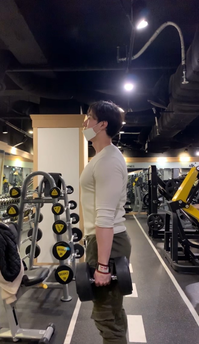 ㅡ덤벨머리부분을 하늘로 향하게 잡는다.