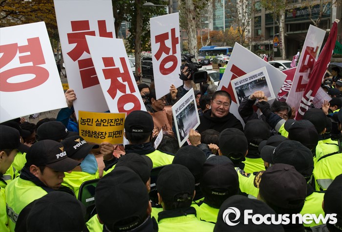 | △ 지난달 16일 오후 경찰청 앞에서 전국농민회총연맹 등 농민단체들이 '백남기 농민 살인 진압, 강신명 경찰총장 파면' 농민 기자회견을 하고 있다. <사진제공=포커스뉴스> |