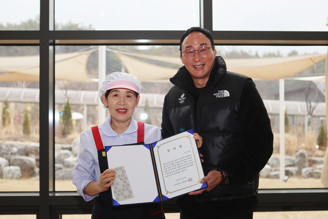 [부자동네타임즈 = 김인수 기자] 대한체육회(회장 이기흥)와 국가대표지도자협의회는 지난 12일 진천 국가대표선수촌 선수식당에서 지도자의 추천을 받은 협력직원(조리, 미화, 관리, 보안, 영선 등) 20명을 선정하여 감사장과 기프트박스를 전달했다.