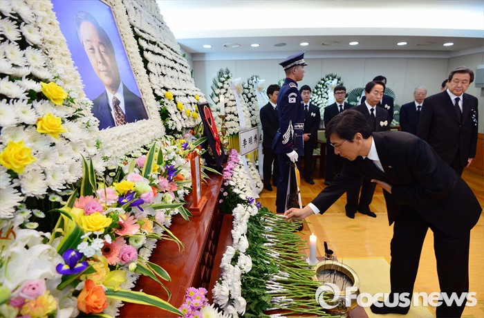 (서울=포커스뉴스) 안희정 충청남도 도지사가 24일 서울 종로구 서울대병원 장례식장에 마련된 故 김영삼 전 대통령의 빈소를 찾아 헌화하고 있다.