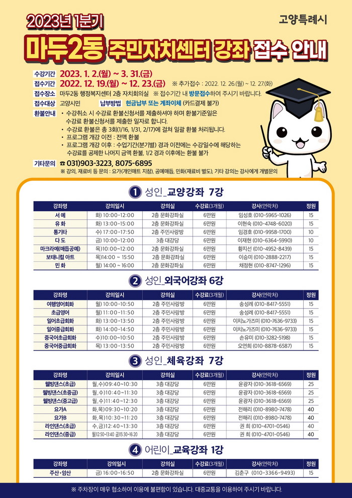 주민자치센터 문화강좌 접수는 오는 19일(월)부터 23일(금), 매일 오전 10시부터 17시(12시~13시 제외)까지 마두2동 행정복지센터 2층 주민자치회 사무실에서 선착순으로 접수하며, 자세한 내용은 고양시청 홈페이지 내 마두2동 주민자치 소식에서 확인이 가능하다.