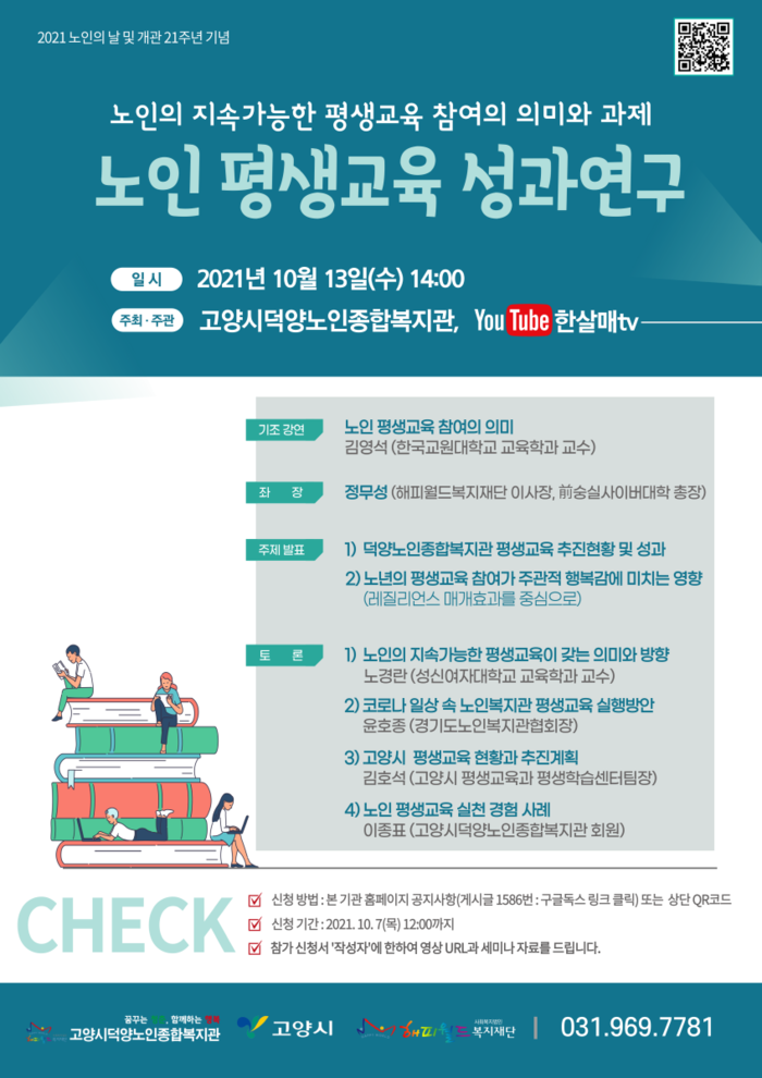 [부자동네타임즈 김인수기자] 고양시덕양노인종합복지관(관장 김정훈)은 오는 10월 13일(수) 오후 2시에 2021 노인의날 및 개관 21주년 기념 「노인 평생교육 성과연구: 노인의 지속가능한 평생교육 참여의 의미와 과제」를 주제로 온라인 유튜브 한살매TV를 통해 세미나를 개최한다.