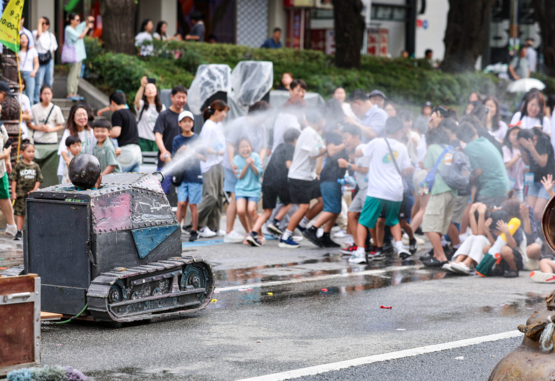 서울 한낮 기온이 32도까지 오르며 더운 날씨를 보인 31일 오후 서울 종로구 혜화역 일대에서 열린 '대학로 워터파크 물싸움 거리극' 공연 중 배우가 관객들에게 물을 뿌리고 있다. 2024.8.31