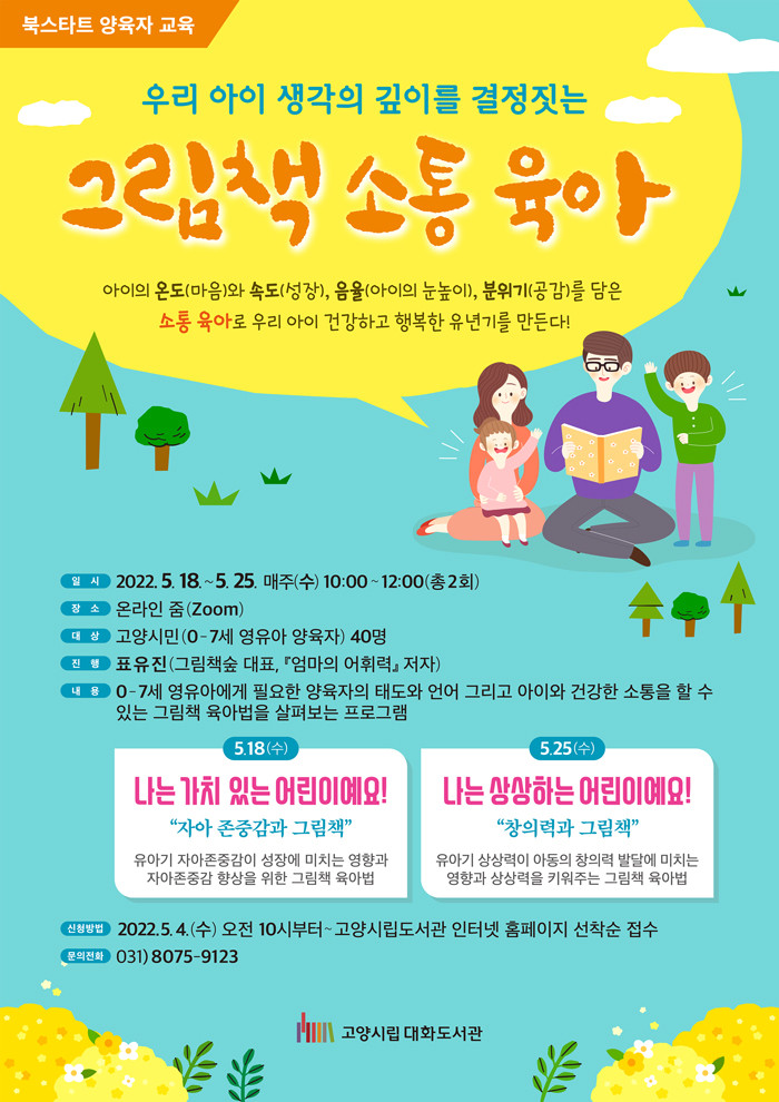 [부자동네타임즈 김인수기자] 고양시 대화도서관이 5월부터 시작하는 북스타트와 연계하여 0-7세 영유아 양육자를 위한 프로그램 그림책 소통 육아를 5월 18일부터 5월 25일까지 운영한다.