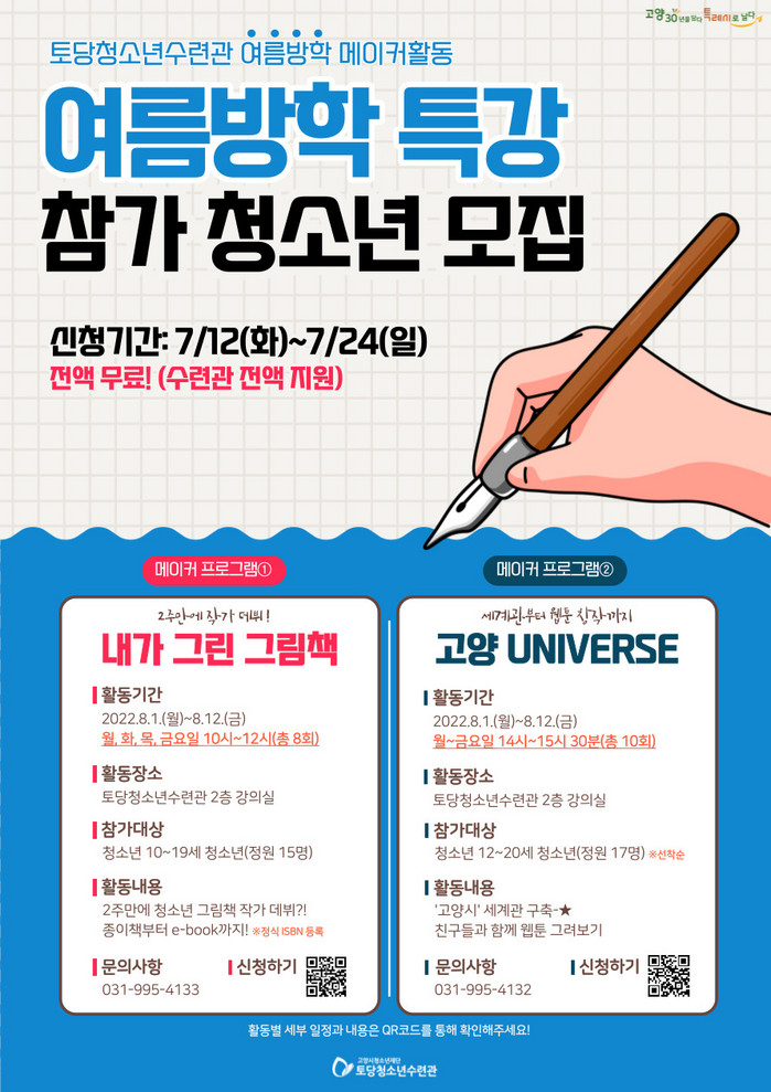 [부자동네타임즈 김인수기자] 고양시청소년재단(이사장 이동환) 토당청소년수련관은 여름방학을 맞은 청소년들을 위해여름방학 특강을 마련, 오는 12일부터 참가자 32명을 모집한다.
