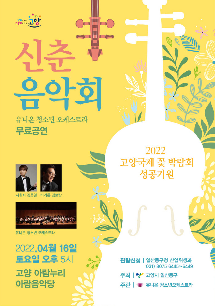 [부자동네타임즈 김인수기자] 고양시 일산동구청(구청장 방경돈)이 4월 16일(토) 17시 고양아람누리 아람음악당에서 2022 고양국제꽃박람회 성공기원 신춘음악회를 개최한다.