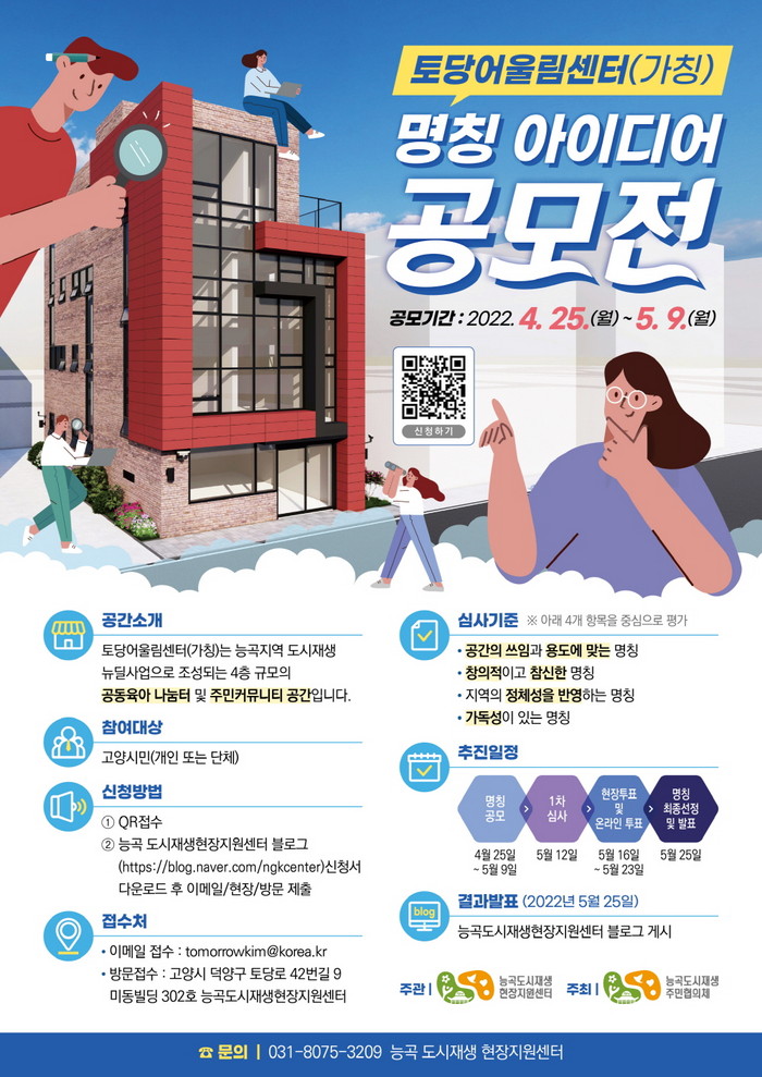 이번 명칭 아이디어 공모전은 토당문화플랫폼 공간의 명칭 ‘능곡1904’,‘키친1904’,‘공감1904’을 지역 주민과 함께 발굴했던 경험을 바탕으로 공간의 의미와 특성을 잘 담아낼 수 있는 새로운 이름을 주민과 함께 찾기 위해 진행된다. 공모전은 능곡 도시재생현장지원센터와 능곡 도시재생 주민협의체가 함께 기획했다.