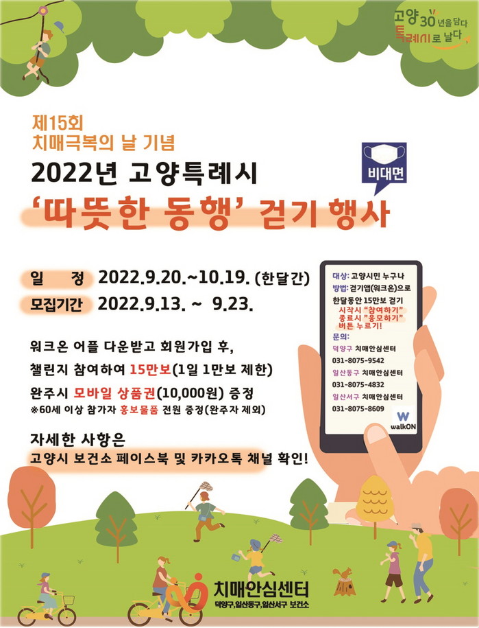 [부자동네타임즈 김인수기자] 고양특례시(시장 이동환) 치매안심센터에서 ‘제15회 치매극복의 날’을 기념해 오는 20일부터 10월 19일까지 치매극복 걷기행사인 ‘따뜻한 동행’을 개최한다.