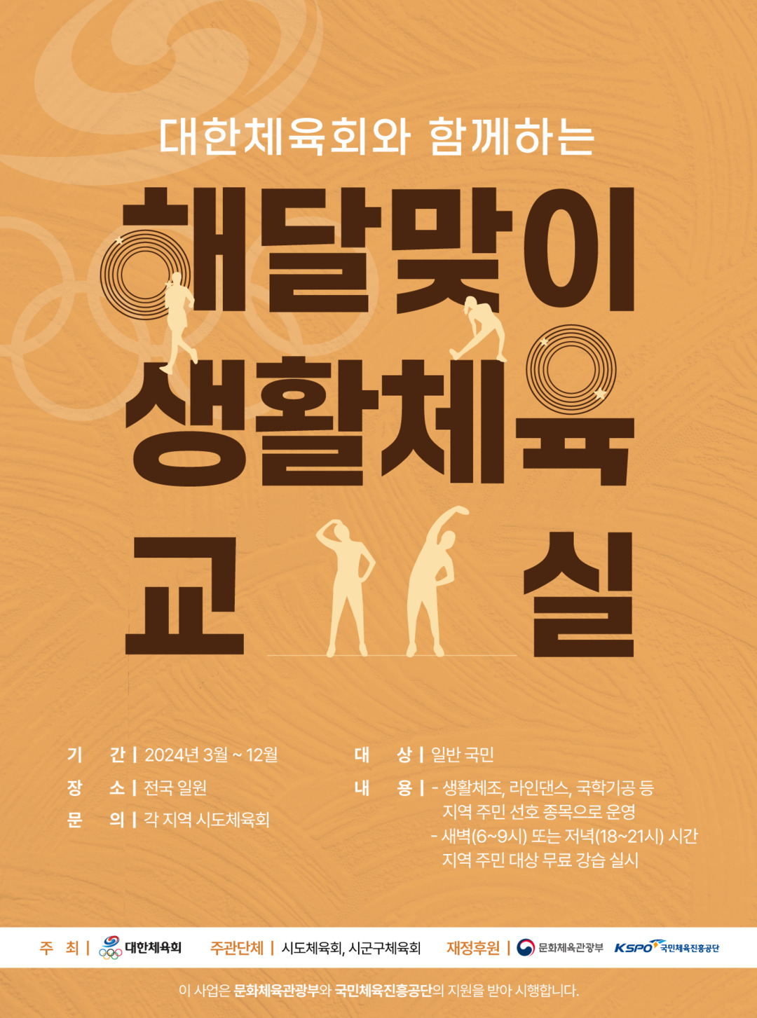 지난 4월 경남을 시작으로 5월 첫 주까지 17개 시·도체육회에서 교실 선정이 완료되어 올해 12월까지 개소별로 주 5일 134회 수업을 진행한다. 체육 분야 전문 지도자 자격을 보유한 생활체육지도자가 생활체조, 댄스 등 강습을 운영하며 참여자들은 이를 통해 스트레스 해소, 근력 강화 등 건강 증진을 기대할 수 있다. 별도의 신청 없이 남녀노소 누구나 수업 장소를 방문하여 무료로 참여 가능하다.