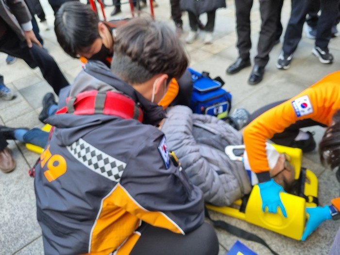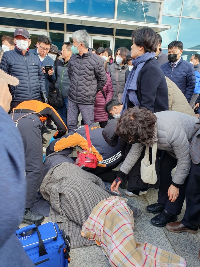 [사진설명] 고양시청원한건립추진연합회 김00 홍보위원장이 쓰려저 119 대원들에게 응급치료를 받고 있다.