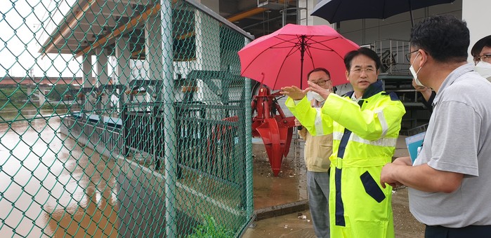이동환 당선인은 30일 새벽 발효된 호우경보로 인한 피해에 대비해 신평 배수펌프장을 방문하고 유량 유입에 따른 배수 능력을 확인했다.