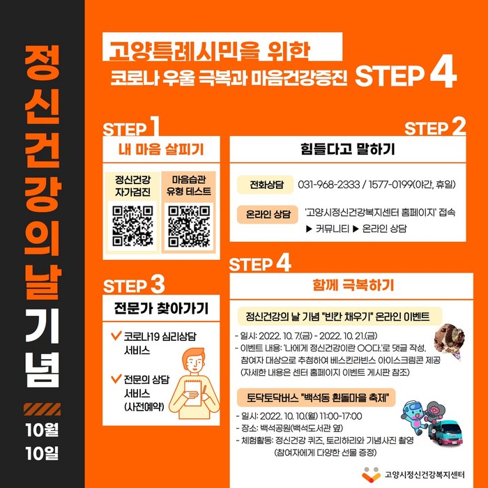 [부자동네타임즈 김인수기자] 고양특례시(시장 이동환) 정신건강복지센터가 정신건강의 날(10월 10일)을 맞아 코로나19 우울 극복과 마음건강을 증진하는 행사를 개최한다.