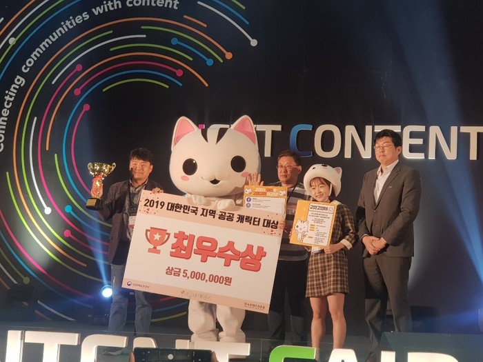 [부자동네타임즈 김인수기자] 고양시 대표 마스코트 고양고양이가 문화체육관광부 주최 한국콘텐츠진흥원 주관 '제2회 우리동네 캐릭터 축제 및 2019 넥스트 콘텐츠 페어’ 시상식에서 최우수상과 상금 500만 원을 받았다.