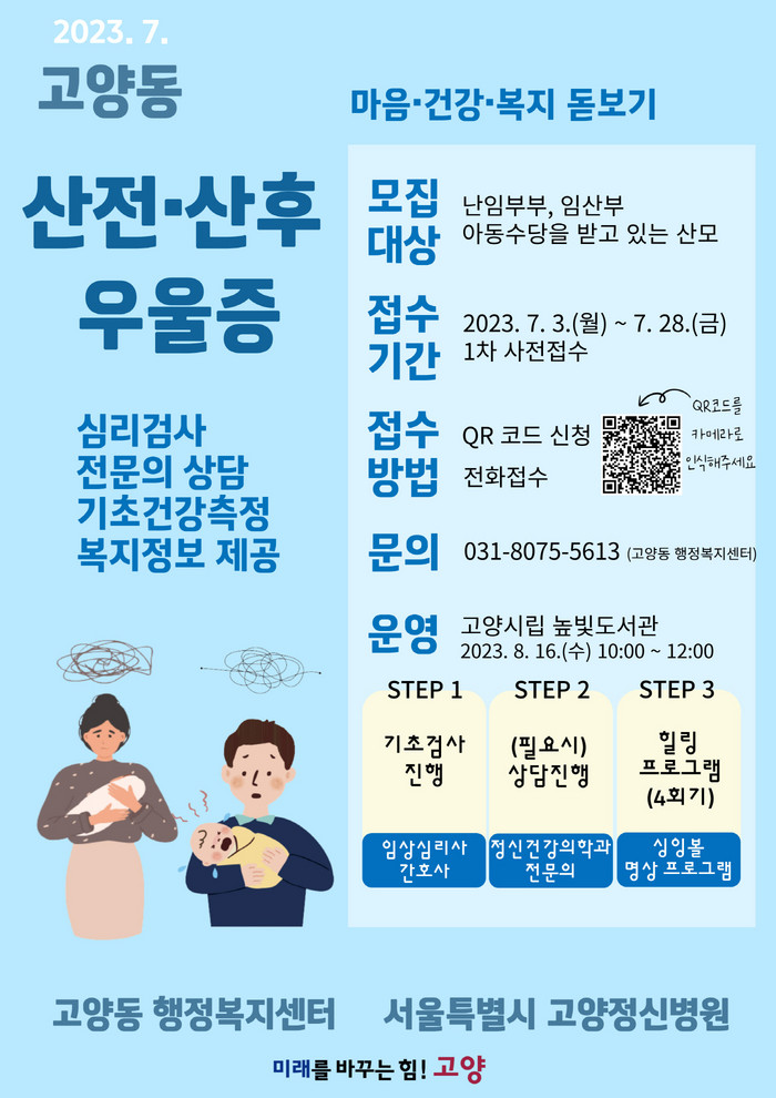 고양동은 이번 보건복지 상담소를 통해 우울증 위험군을 선별하고, 정서적 지지프로그램을 제공할 계획이다. 또한 상담소에 참여한 모든 대상자에게 임신, 출산, 양육제도에 대한 안내문을 제공하여 사회적 지지체계를 이용할 수 있는 정보를 제공할 예정이다.
