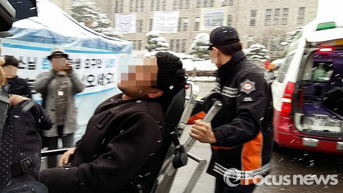 | △ 3일 오전 9시 30분쯤 서울 중구 동국대학교에서 단식투쟁 중이던 김건중 동국대 부총학생회장이 병원으로 이송되고 있다. <사진제공=동국대 총학생회> |