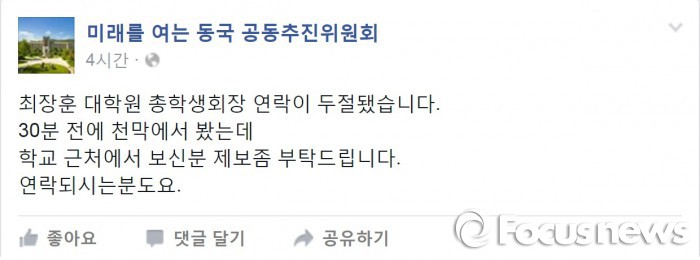 또 동국대 총장과 이사장의 퇴진을 요구하며 투신선언을 한 바 있는 최창훈 동국대 일반대학원 총학생회장이 연락을 끊고 잠적한 것으로 알려져 불안감이 증폭되고 있다.