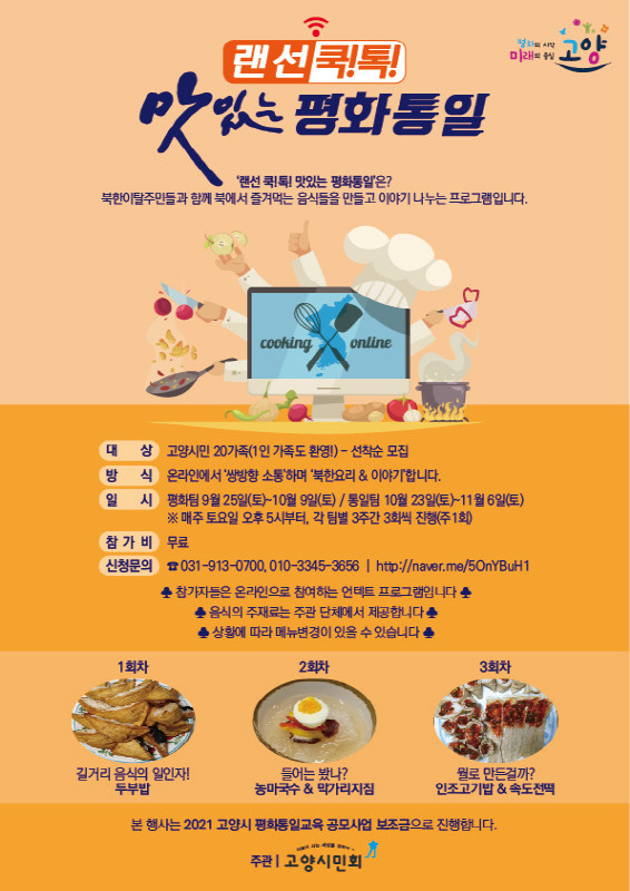 ‘랜선 쿡! 톡! 맛있는 평화통일’은 고양시민회가 주관하여 진행하는 프로그램이다. 마찬가지로 온라인 방식으로 진행한 작년 프로그램이 좋은 반응을 얻어 올해는 더욱 확대하여 진행하게 됐다.