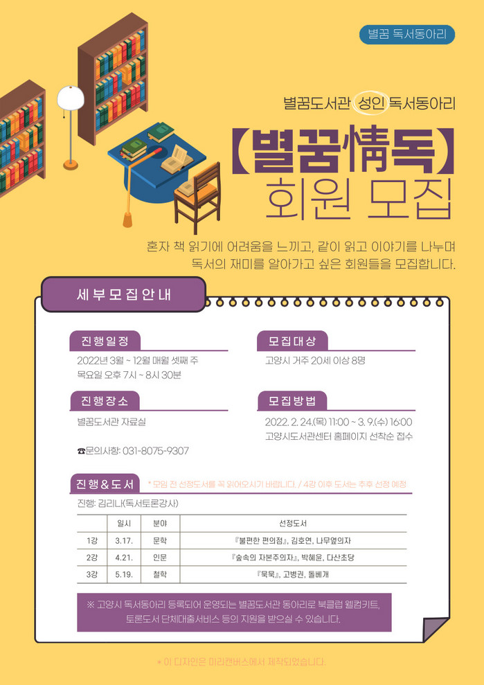 [부자동네타임즈 김인수기자] 고양시 별꿈도서관이 고양시민(20세 이상)을 대상으로 성인 독서토론 동아리‘별꿈情독’ 회원을 모집한다.