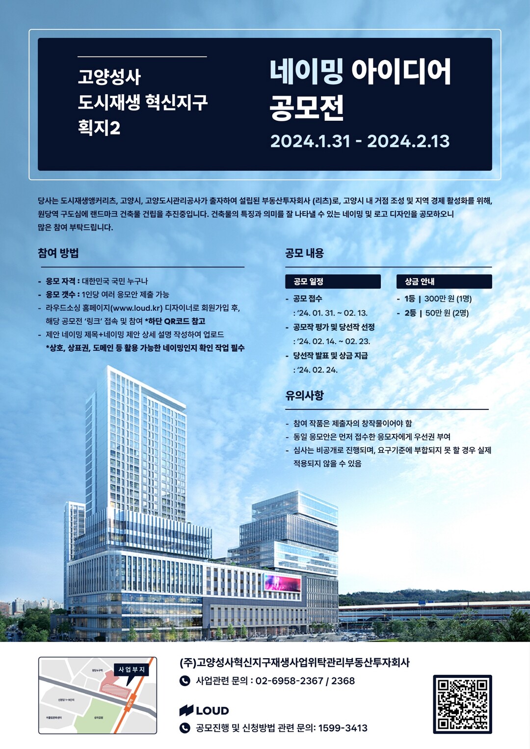 고양성사 도시재생 혁신지구 사업의 시행자인 ㈜서울투자운용에서 실시하는 네이밍 공모전은 라우드소싱 플랫폼을 통해 진행되고, 특별한 자격 요건이 없이 누구나 신청이 가능하다. 1등 당선작에는 300만원 등 총 상금 400만원이 지급 될 예정이다.