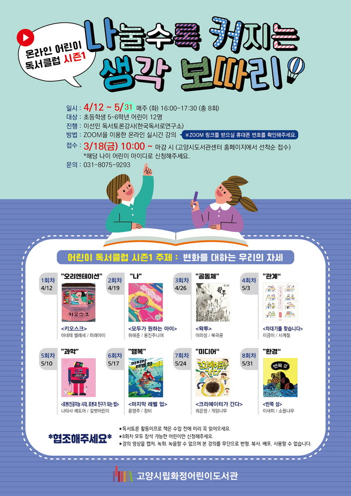 [부자동네타임즈 김인수기자] 고양시 화정어린이도서관은 독서토론 프로그램인 온라인 어린이 독서클럽 나눌수록 커지는 생각 보따리 시즌1을 운영한다고 밝혔다.