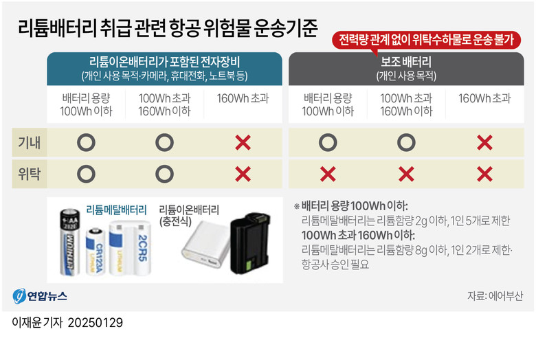 다만 보조배터리와 관련해선 리튬메탈배터리는 리튬 함량이 2g 이하, 리튬이온배터리는 100Wh 이하인 경우에만 기내 휴대만 가능하다. 보조배터리는 위탁수하물로는 부칠 수 없다.