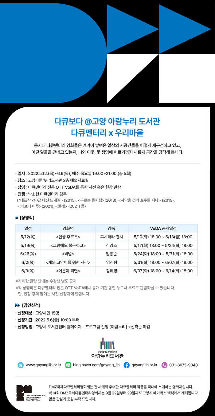 [부자동네타임즈 김인수기자] 예술특성화 고양 아람누리도서관에서 오는 5월 12일부터 5주간 DMZ국제다큐멘터리영화제와 공동으로 기획한 강연 다큐멘터리×우리마을을 개최한다.