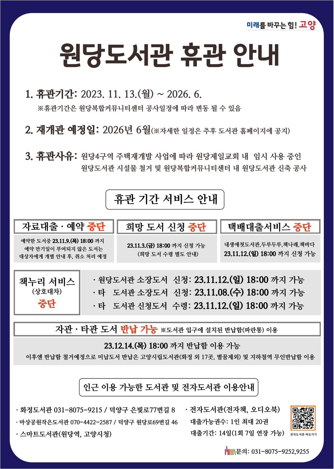 원당 도서관 휴관에 따라 도서 대출, 희망도서 신청, 상호대차 서비스 등 모든 서비스가 중단된다. 단, 도서관 입구에 설치된 무인 반납함은 12월 14일(목)까지 이용이 가능하다.