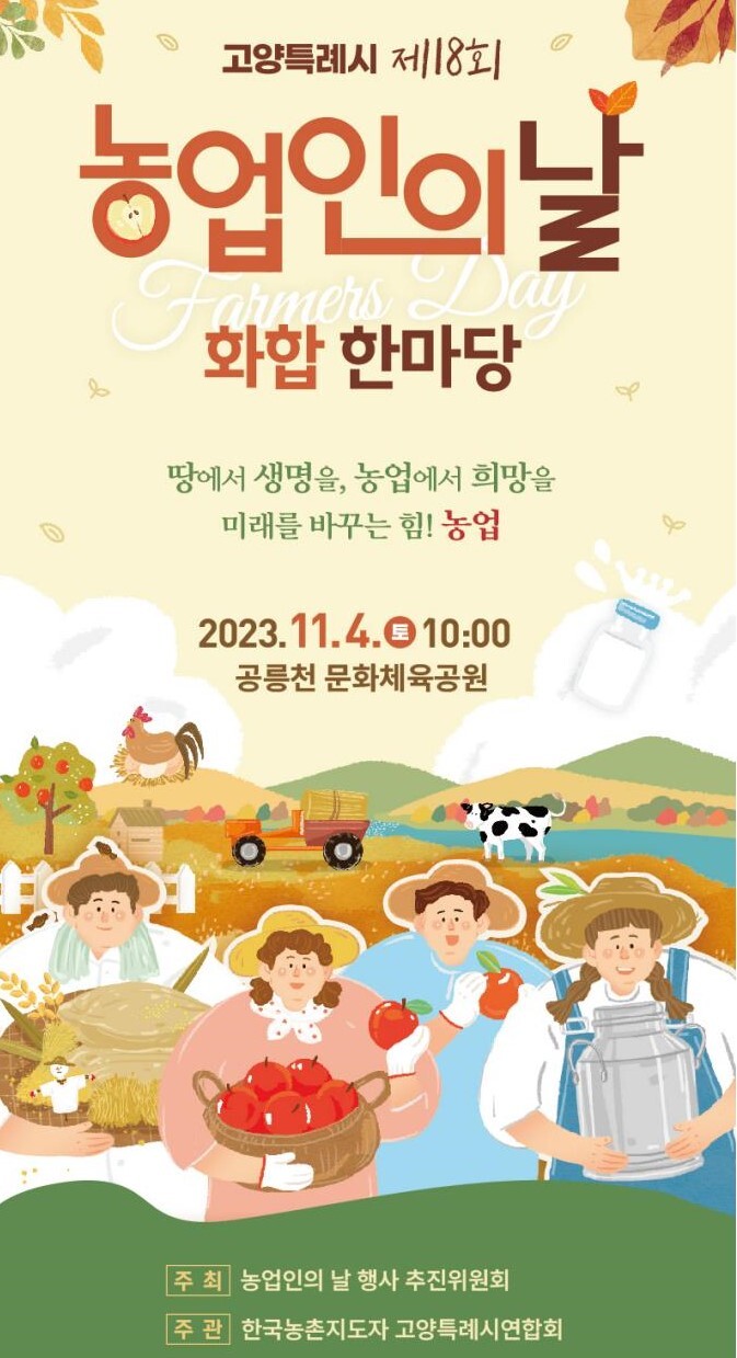 [부자동네타임즈 = 김인수 기자] 제18회 고양시 농업인의 날 행사가 오는 11월 4일 관산동에 위치한 공릉천 문화체육공원에서 ‘땅에서 생명을, 농업에서 희망을, 미래를 바꾸는 힘! 농업’이란 주제로 열린다. 이날 공연, 전시, 체험 등 다양한 행사가 진행될 예정이다.