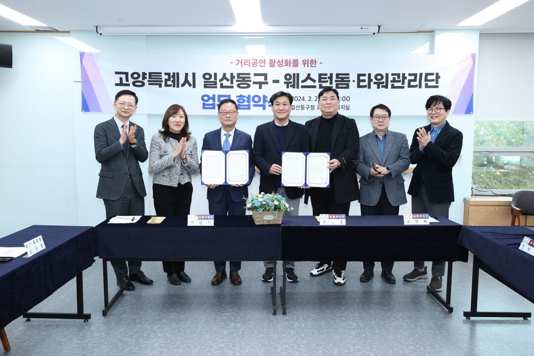 [부자동네타임즈 = 김인수 기자] 고양특례시 일산동구가 지난 22일 청사 3층 직원복지실에서 웨스턴돔·타워 관리단과 웨스턴돔 내 거리공연 활성화 협력 체계 구축을 위한 업무협약을 체결했다.
