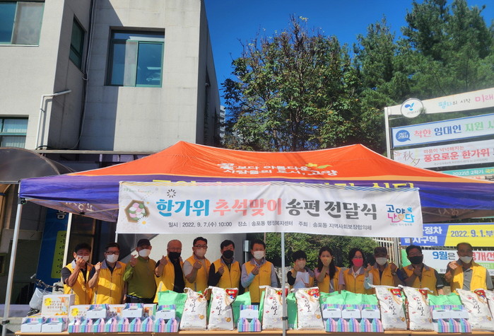 정윤채 송포동장은 “관내 모든 분들이 즐거운 한가위를 보내시길 바라며 이번 나눔 활동으로 더 많은 복지서비스를 제공하도록 힘쓰겠다. 또한, 지역사회 내 어렵게 생활하시는 분들이 있다면 동에 말씀해주시고 복지사각지대 발굴을 위해 지역사회를 더욱 촘촘히 살피도록 노력하겠다”고 전했다.