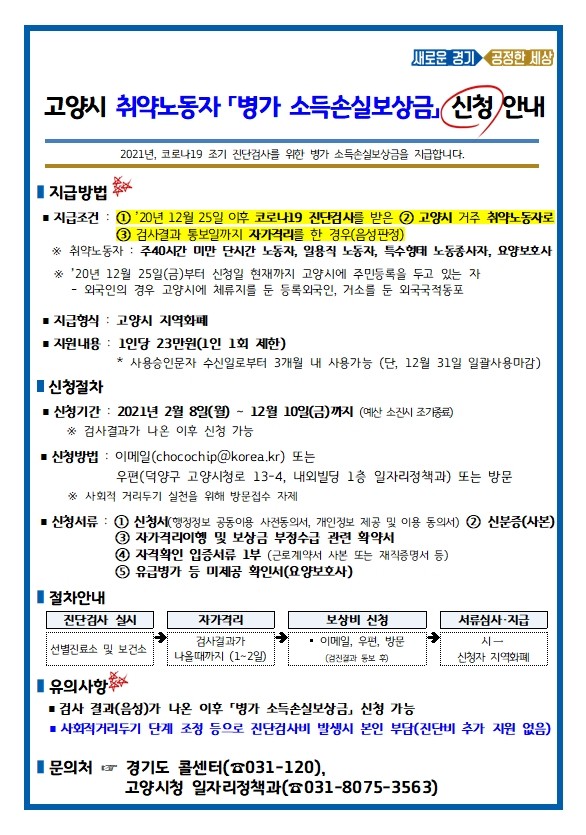 [부자동네타임즈 김인수기자] 고양시가 취약계층 노동자가 생계 걱정 없이 코로나19 조기 진단검사를 받을 수 있도록 2021년 병가소득 손실보상금 지원사업을 확대 시행한다.