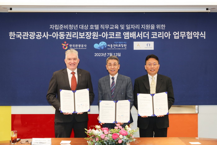 [부자동네타임즈 김인수기자] 한국관광공사(이하 공사)는 13일 공사 서울센터에서 아동권리보장원(이하 보장원), 아코르앰배서더코리아(이하 AAK)와 함께 자립준비청년(보호종료아동)*대상 호텔서비스 교육과 취업 지원을 위한 업무협약을 체결했다.