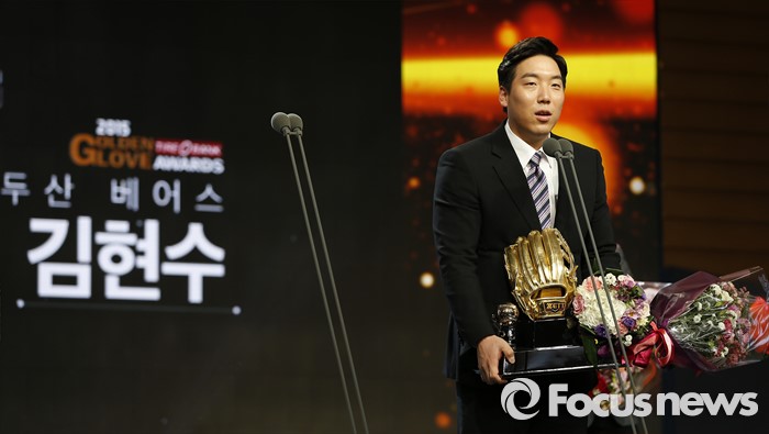 | △ 지난 8일 오후 서울 서초구 The-K호텔에서 열린 2015 KBO 골든글러브 시상식에서 외야수 부문을 수상한 두산 김현수가 수상소감을 말하고 있다. <사진제공=포커스뉴스> |