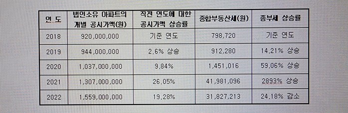 문제는 2020년 법인에 대한 부동산 세제가 강화되면서 시작됐다. 당시 부동산 시장의 열기가 뜨거워지며 법인 설립을 통한 투기가 빈번하게 발생하였다. 정부는 6.17부동산 대책을 통해 법인의 주택소유에 대한 규제를 강화했다. 법인이 보유한 주택에 대해 종부세율이 인상돼 개인 세율 중 최고 세율이 적용되었다. 더 나아가 법인이 보유한 주택에 대해서는 6억원의 공제도 폐지 시켰다. 이 같은 규제는 2021년 종부세 과세부터 적용되었다. 당시 정부는 규제 시행 전에 법인이 취득한 1주택도 적용 대상에 포함 시켰다. 그 결과 2021년 6월 1일을 기준으로 하여, 상기법인 소유 아파트에 부과된 종부세액은 2020년도의 세액에 비하여 28.93배가 높아졌다. 그 구체적인 내역은 아래 도표와 같다.