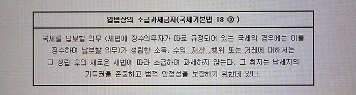 국세를 납부할 의무 (세법에 징수의무자가 따로 규정되어 있는 국세의 경우에는 이를 징수하여 납부할 의무)가 성립한 소득, 수익 ,재산 ,행위 또는 거레에 대해서는 그 성립 후의 새로운 세법에 따라 소급하여 과세하지 않는다, 그 취지는 납세자의 기득권을 존중하고 법적 안정성을 보장하기 위한데 있다.