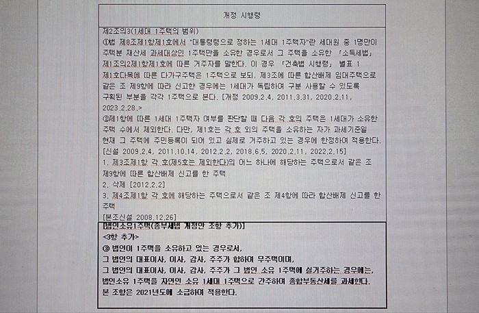 [부지동네타임즈 김인수기자] 지난해 여야가 합의해 개인이 보유한 주택에 대한 종합부동산세(이하 종부세) 부담이 크게 줄었지만 법인에 대해서는 문재인 정부 당시 강화된 기준이 여전히 적용되고 있다. 이에 법인과 개인을 통틀어 1주택을 보유한 사람의 세 부담이 지나치게 높아 역차별이라는 지적이 나온다.