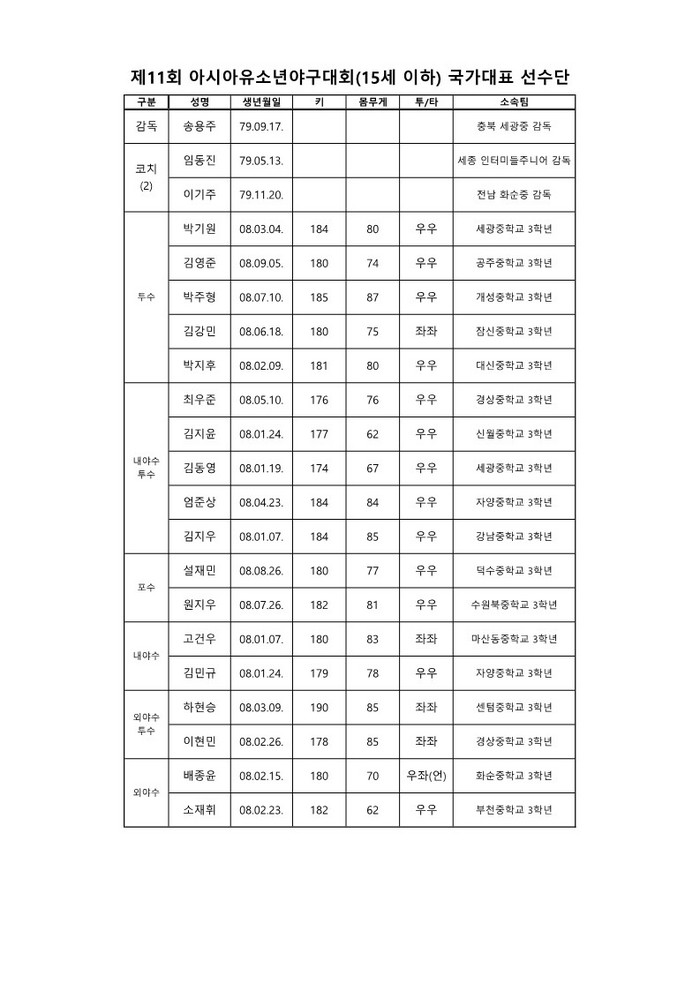 아울러, 협회는 지난 4일(화) 개최된 경기력향상위원회 회의에서 제70회 전국중학선수권대회 최우수선수상을 수상했던 김동영(세광중 3)과 우수투수상의 박기원(세광중 3) 등이 포함된 18명의 선수를 선발했다.