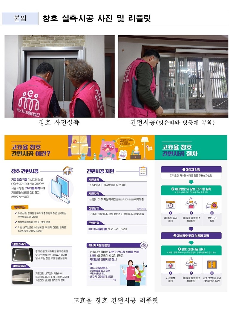 창호 사전실측 및 간편시공을 맡는 에너지서울동행단은 서울시 공공일자리인 ‘동행일자리’ 사업의 일환으로, 취업약자가 기후위기 약자를 돕는 선순환 구조의 녹색일자리 창출이라는 뜻깊은 의미를 담고 있다.