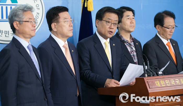 (서울=포커스뉴스) 19일 오후 서울 여의도 국회 정론관에서 경북 지역 새누리당 의원들이 기자회견을 열고 최근 보도된 경북 지역 현행 15석에서 2석을 줄인 13석으로 감소하게 된다는 선거구 여야 협상안과 관련 현행보다 1석 감소된 14석으로 획정해 줄 것을 촉구하고 있다. 왼쪽부터 이철우, 김광림, 김태환, 장윤석, 김종태 의원.