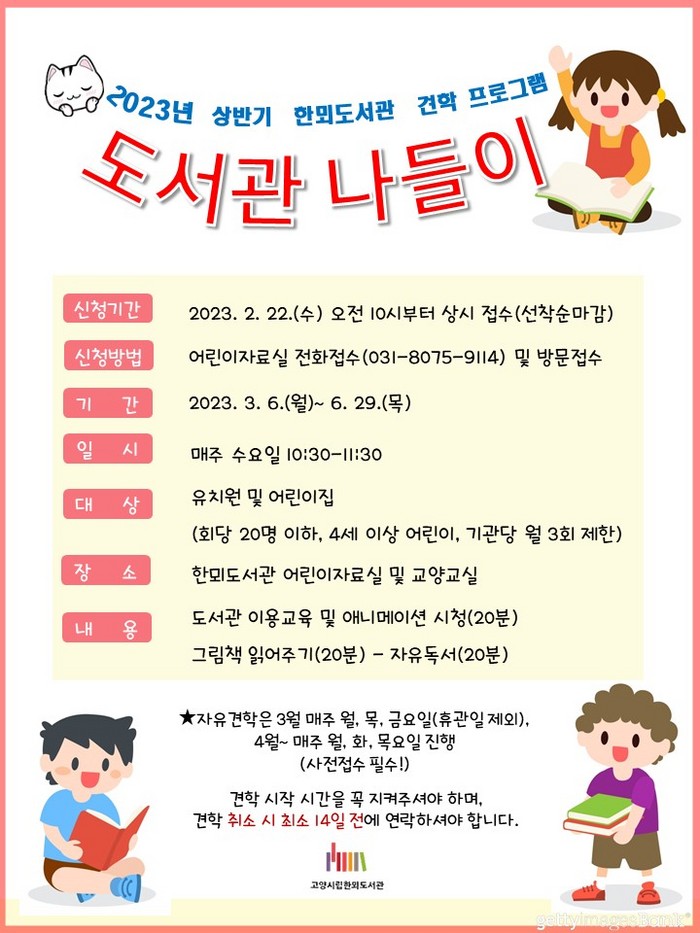 [부자동네타임즈 김인수기자] 고양특례시(시장 이동환) 한뫼도서관은 3월부터 어린이 견학 프로그램 도서관 나들이를 운영한다. 도서관은 2월 22일부터 유치원 및 어린이집을 대상으로 참여 신청을 받는다고 전했다.