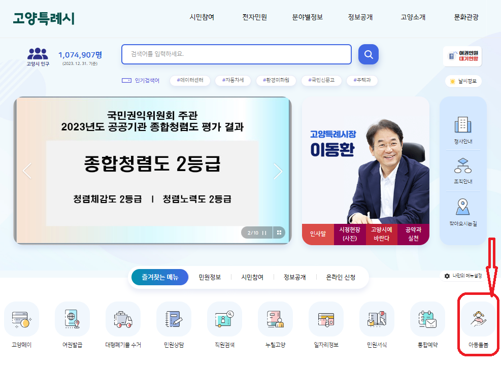 ‘다모아 아동돌봄e’는 시청 누리집 즐겨찾기 메뉴를 통해서 바로가기를 할 수 있다.